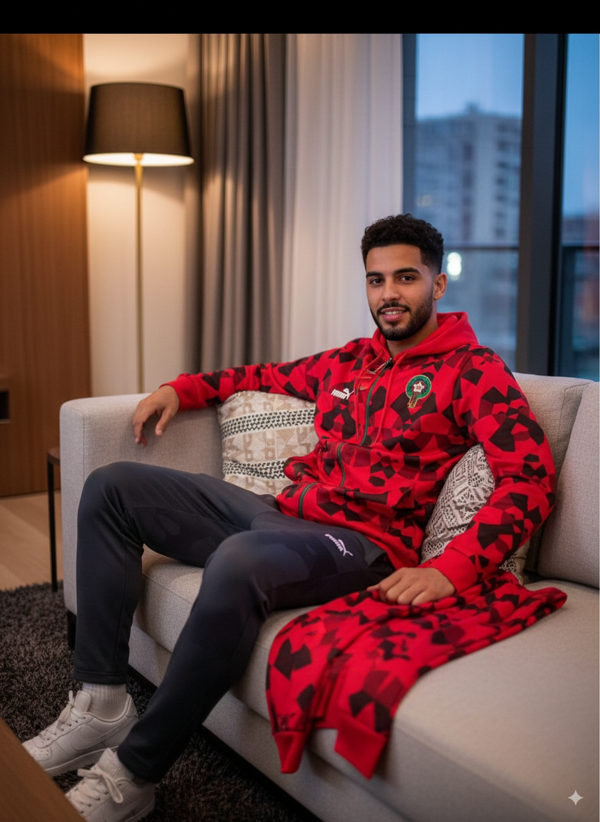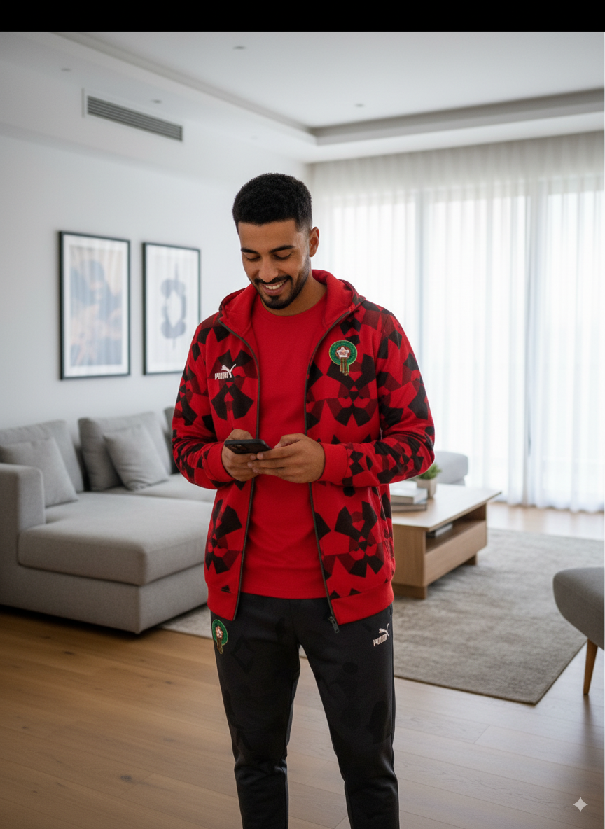 تصميم رسمي بلون أحمر وأسود مستوحى من روح المنتخب المغربي 🇲🇦، بشعار المغرب مطبوع على الصدر، وشعار الجامعة الملكية لكرة القدم مطرز بجودة عالية.