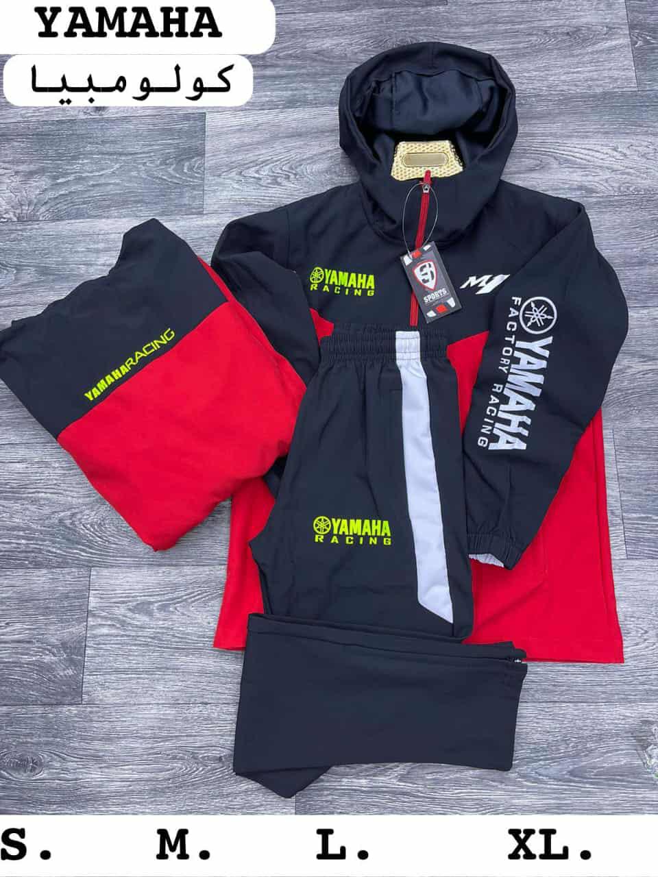 الطقم يتكوّن من جاكيت بقبعة + بنطال بتصميم رياضي عصري، مع طباعة شعار Yamaha Racing لمظهر قوي وجذاب.